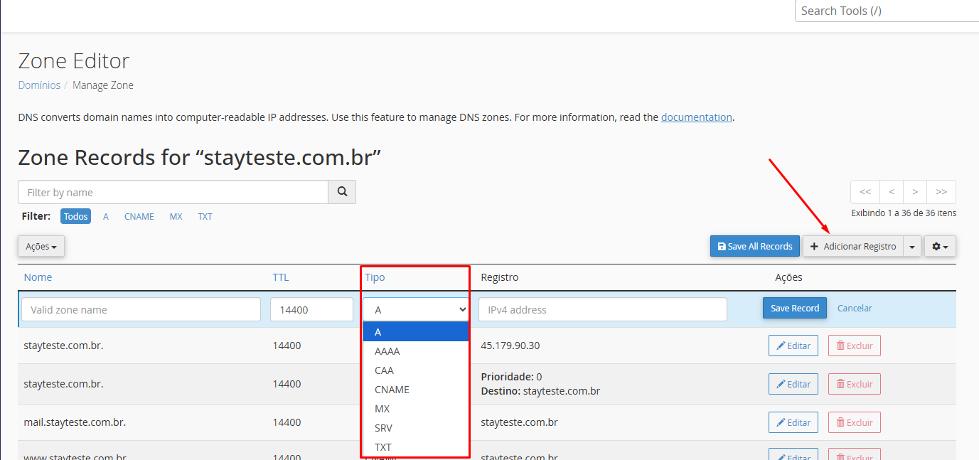 Tipo: escolha o tipo de registro que deseja criar, A, MX, CNAME, etc.
