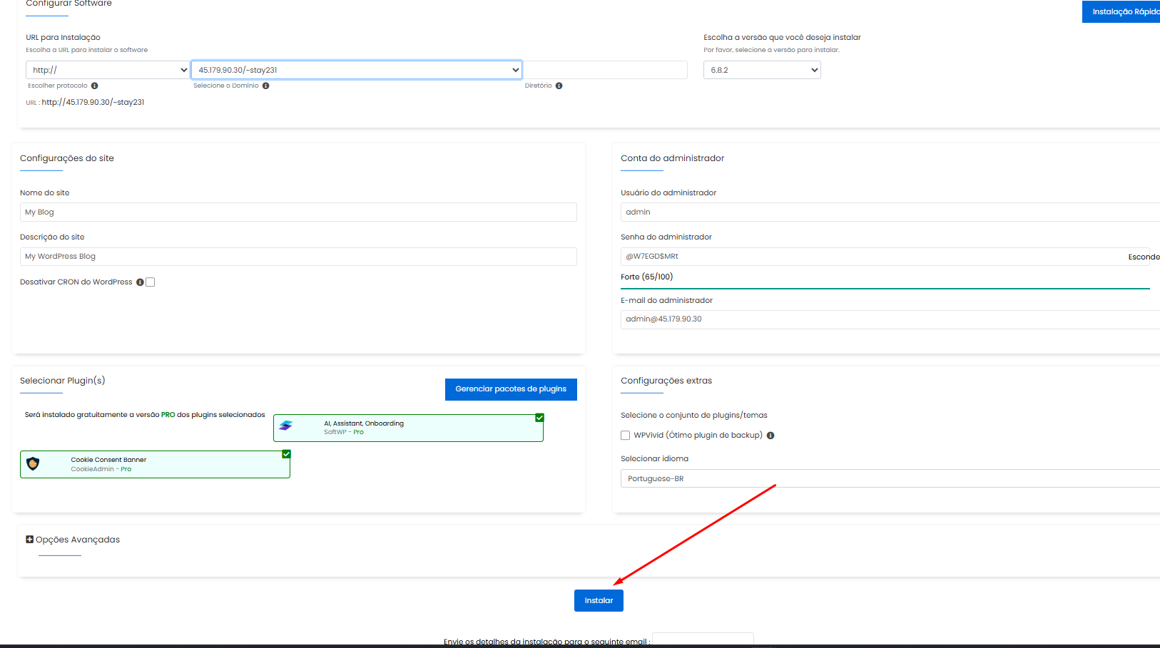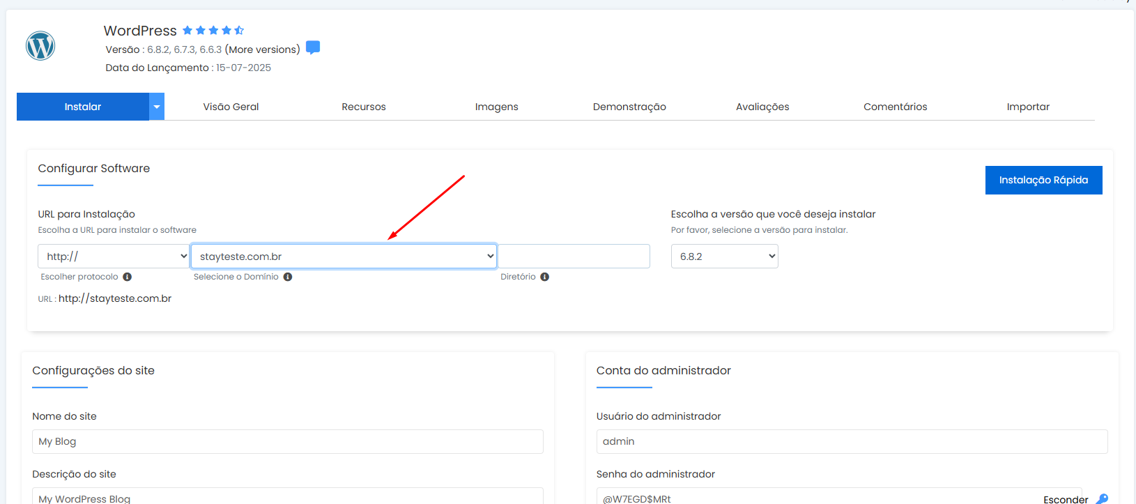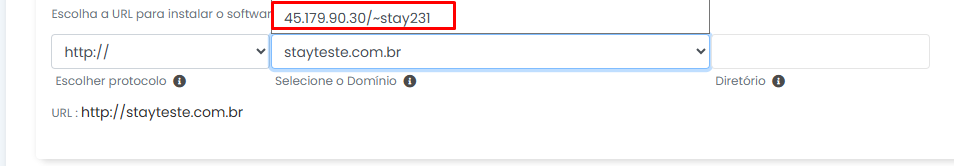 Na seção Configurar Software, no campo de URL, selecione a opção que mostra o endereço do domínio temporário (exemplo: seuIp/~seulogin).