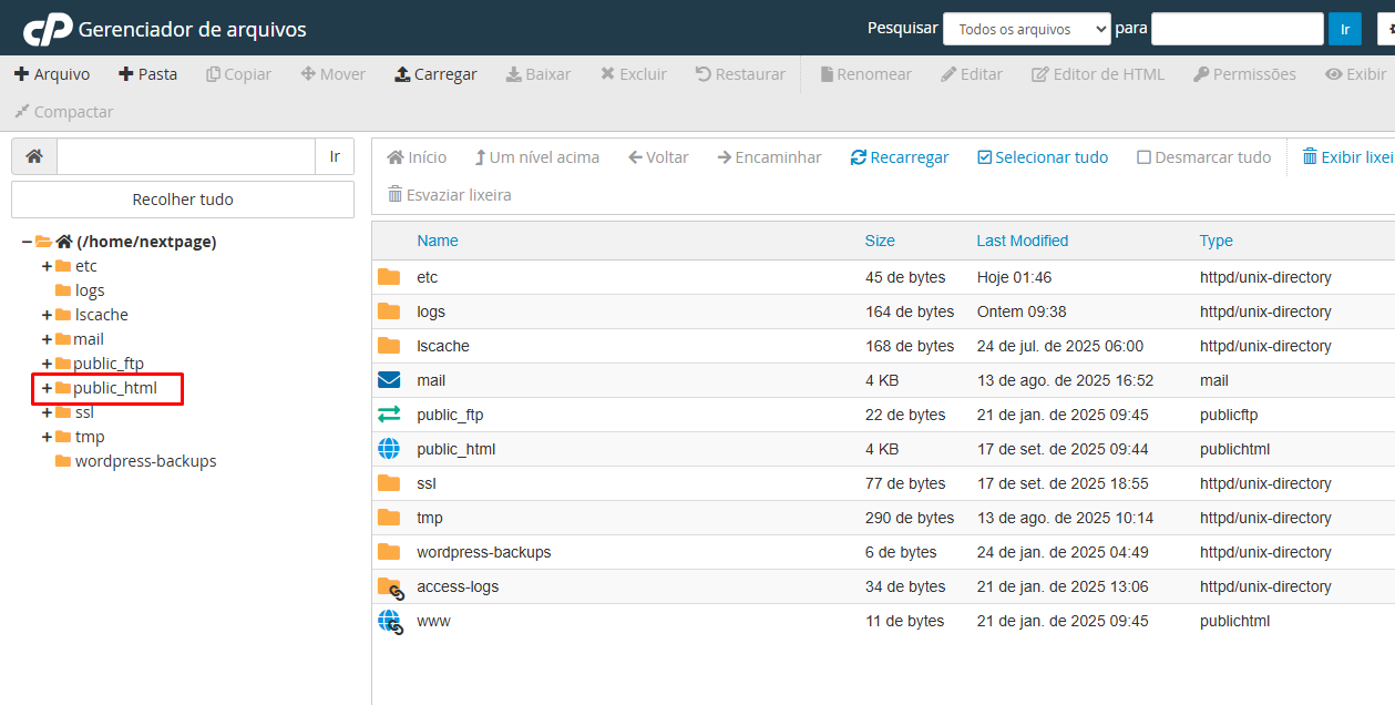 📌 No Gerenciador de Arquivos, você terá acesso a diversas pastas. Para localizar a pasta raiz do seu site, siga as instruções: