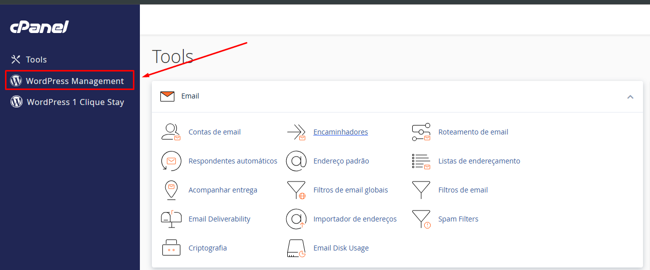 Dentro do seu cPanel, clique em WordPress Management na barra lateral esquerda.