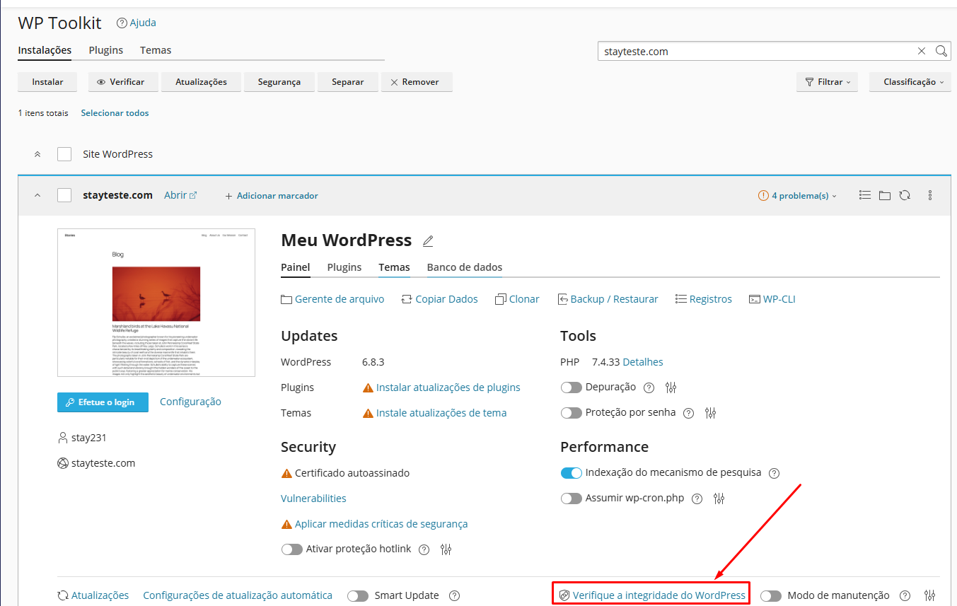Na nova tela, localize o seu site WordPress e clique sobre ele para abrir as opções do WP Toolkit.