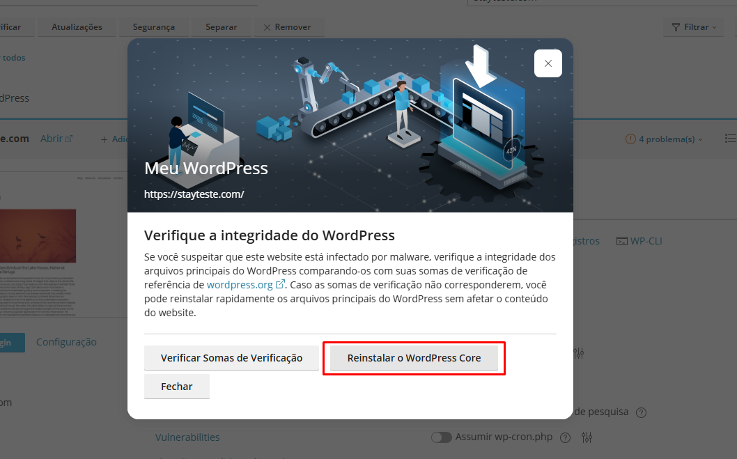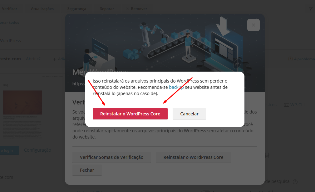Na janela que se abrir, clique em Reinstalar o WordPress Core.