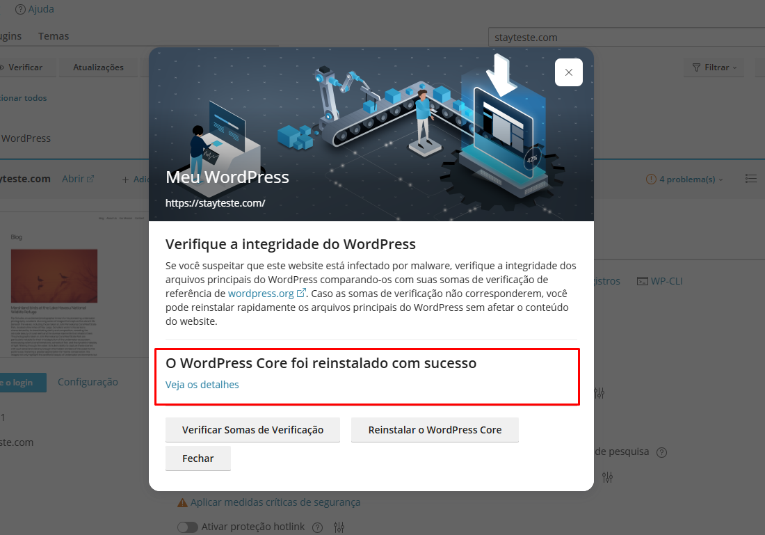 “O WordPress Core foi reinstalado com sucesso”.